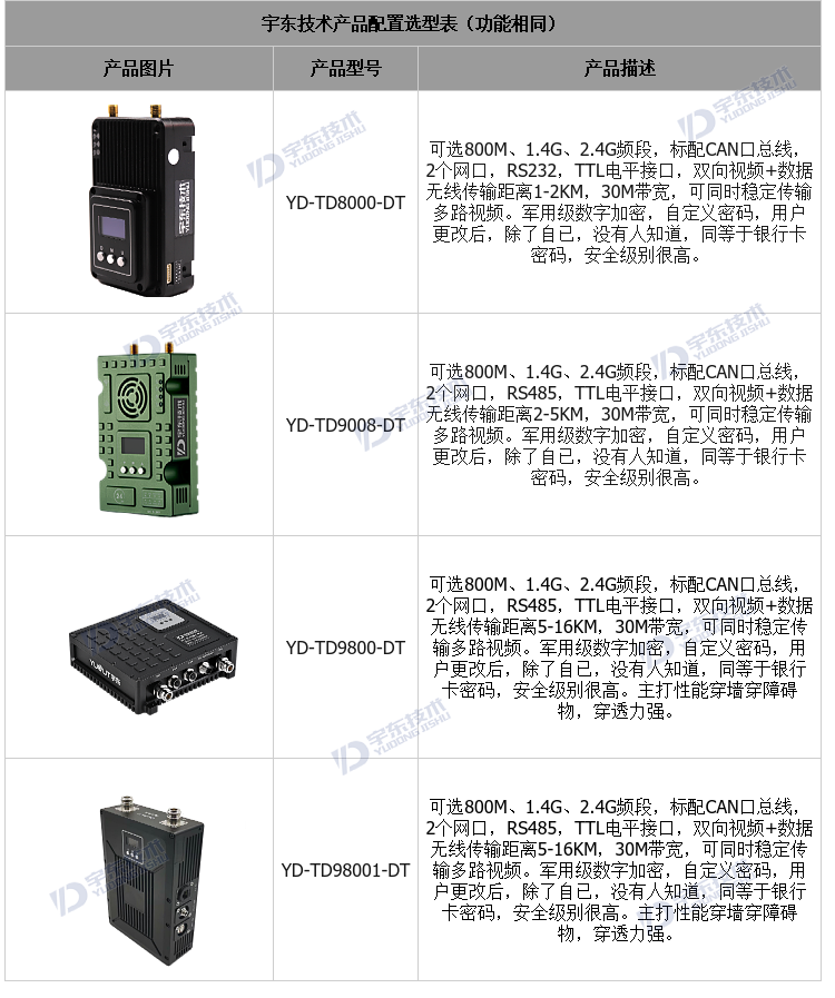 YD-TD9800-DT低時延無線圖傳系統,采用工業級無線高速跳頻傳輸技術,非視距,非WIFI,集合正交頻分復用時分多址調制及MIMO多進多出容量技術,完全基于IP互聯網協議,將信道資源在時間上通過時隙、頻率上通過子載波來靈活分配給多個用戶,在單一頻率點最大限度的提供多用戶接入,完全實現雙向透明通道寬帶傳輸。通道最大支持30Mbps吞吐量,視距可傳輸:10-18公里。系統為純硬件連接,即插即用;創新性液晶一體化設計、豐富的CAN總線、RS-232、TTL電平接口,更好的用戶角度體驗。且系統具有很強的抗多徑干擾能力,克服模擬技術和常規調制技術下多徑反射及遮擋所帶來的困擾,實現在復雜的環境下多點傳輸寬帶數據、視頻、音頻??蓮V泛應用于工業自動化、工業機器人、無人機等通信工作。