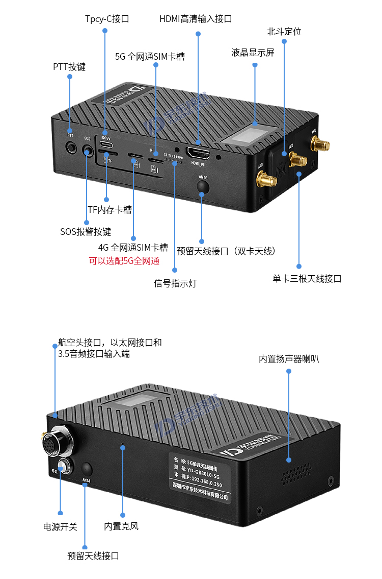 YD-GB8010-5G本款5G單兵圖傳產(chǎn)品為新研發(fā)的,具備不少于兩個(gè)SIM卡槽,同時(shí)支持不少于兩個(gè)不同運(yùn)營(yíng)商網(wǎng)絡(luò),專門針對(duì)自然災(zāi)害,國(guó)家消防救援,應(yīng)急通信指揮調(diào)度的新標(biāo)準(zhǔn)而開發(fā),我們的參數(shù)基本完全滿足各種需求,各地方不一樣分單卡和多卡,詳細(xì)資料具體可以聯(lián)系公司業(yè)務(wù)。